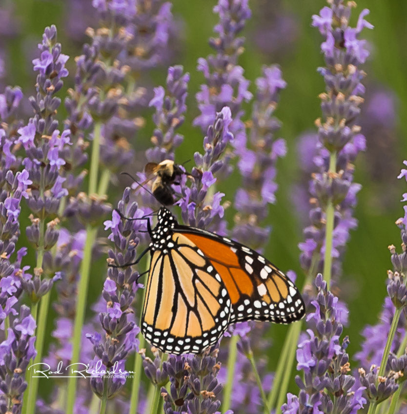 Monarch butterfly and Bumblebee Working Side by Side on Lavender