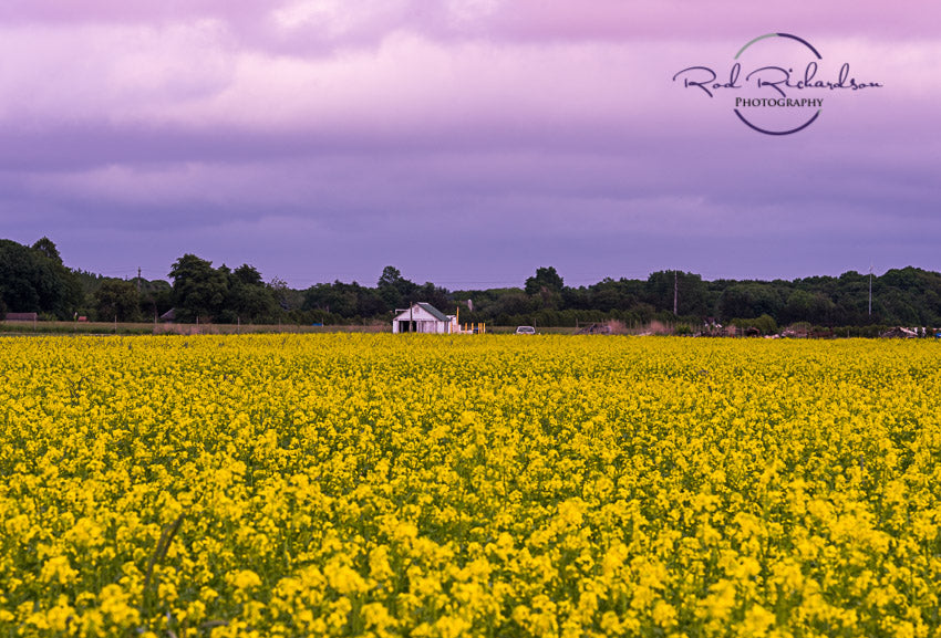 Mustard, grown here as a cover crop, stretches across the field in golden waves, while the sky above glows in rich, moody purples – a unique interplay of nature and technique. This piece brings together rural tranquility with artistic vision, perfect for adding color and atmosphere to any space.