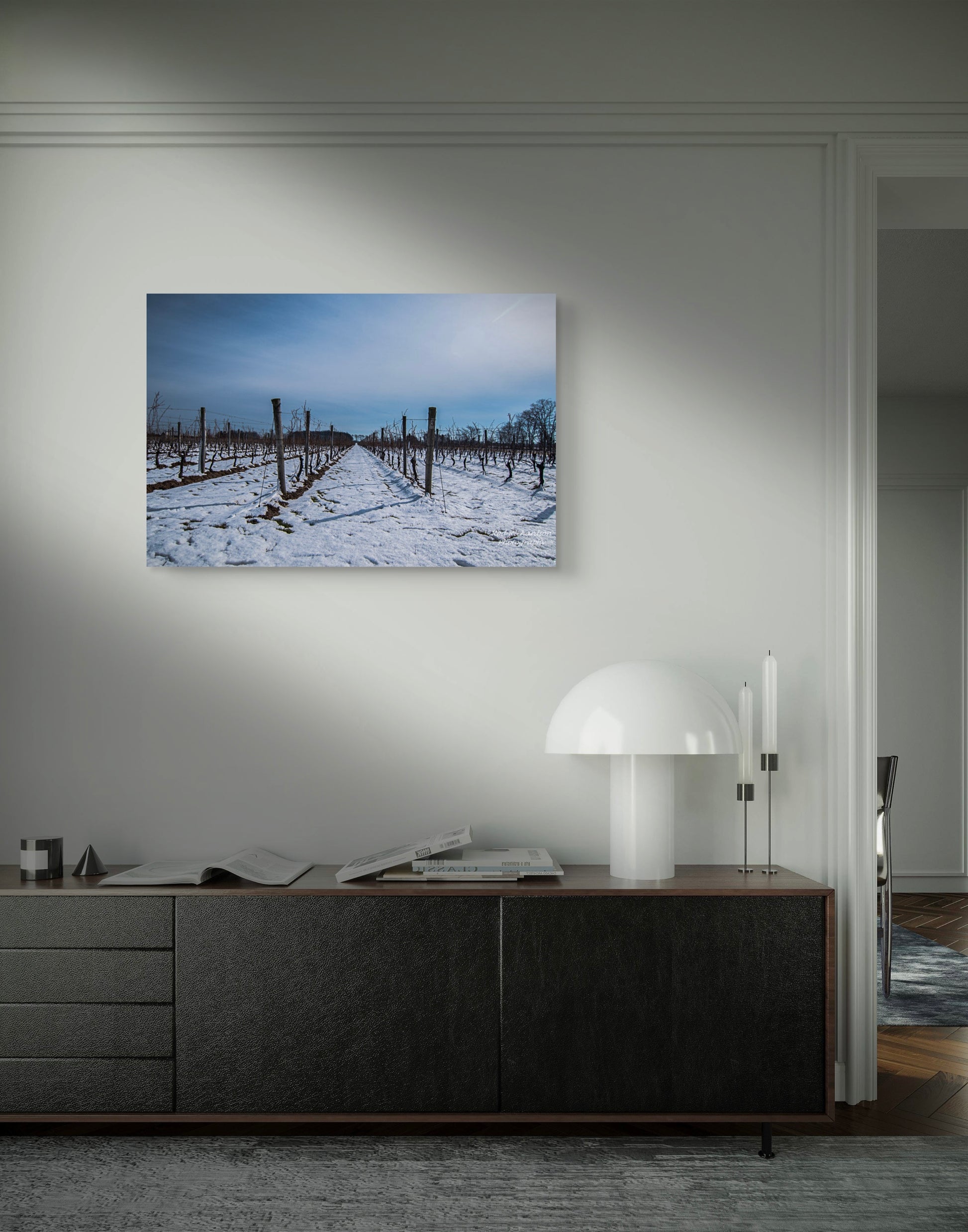 Snow settles between the rows of vines, turning the vineyard into a quiet winter landscape. There’s a calm in the stillness, a simple beauty that only winter can bring. A piece that brings the peaceful silence of nature into your home.